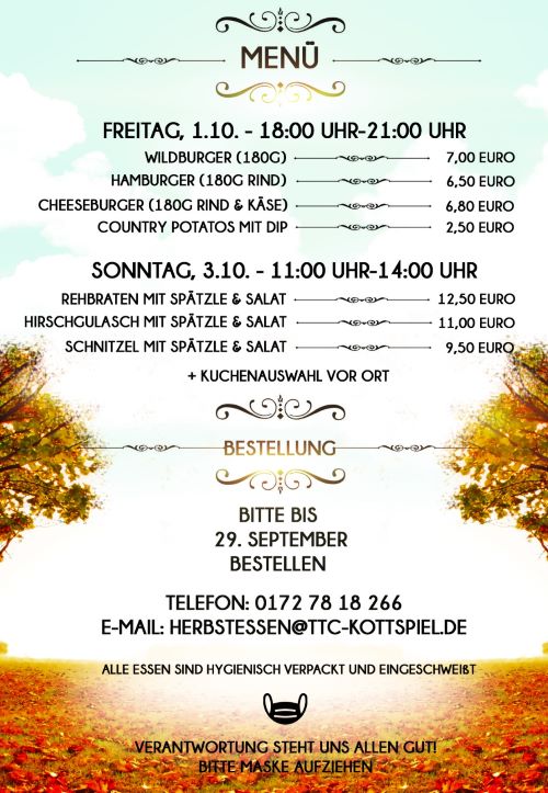 Es ist mittlerweile Tradition - der TTC Kottspiel veranstaltet wieder sein Herbstessen am 3. Oktober. Wie letztes Jahr gibt es hier auch wieder dieses Jahr die Möglichkeit, die Leckereien abzuholen. Unser Chefkoch hat auch dieses Jahr wieder einige Leckereien für jeden von euch einfallen lassen. Folgende Essen haben wir für euch: